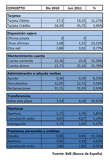 Para que os resulte más cómodo, he preparado una tabla resumen que os adjunto, con los datos del informe publicado por el BdE en su web: www.bde.es/clientebanca/comisiones/comisiones.htm