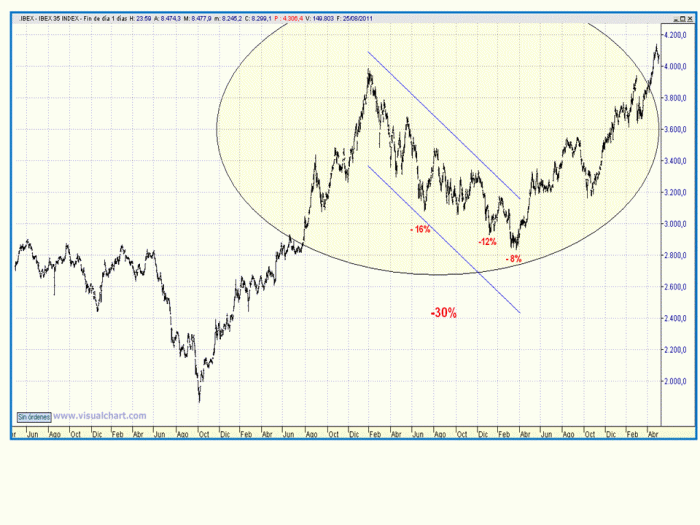 Lo que si sabemos los profesionales es que cuando se inicia una fase de crecimiento en las bolsas, las mayores subidas se producen en los primeros seis meses, pero antes puede pasar por ejemplo como sucedió en el periodo 1994-1996, que previo al inicio de la fase alcista el mercado tuvo tres caídas importantes, como se puede ver en este gráfico del ibex-35, donde se puede observar perfectamente la fase de crecimiento de la bolsa por la bajada de tipos de interés e inyección de liquidez (oct 92/ene 94), y la fase de ajuste hasta la introducción de las reformas (1994-1995).