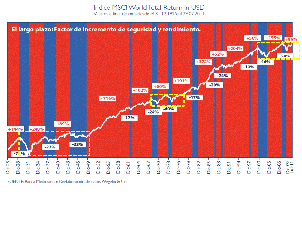 Desde 1925 se han producido dos grandes periodos de lateralidad de la bolsa mundial, uno durante la Gran Depresión y la crisis de la postguerra, y el otro durante la crisis de inflación de la década de 1970. Después de estos dos periodos de larga lateralidad se produjeron los dos episodios más importantes de crecimiento de la bolsa mundial hasta la fecha. Hoy estamos inmersos en otro de esos periodos de lateralidad, que encadeno la crisis de las punto.com con la crisis financiera actual.