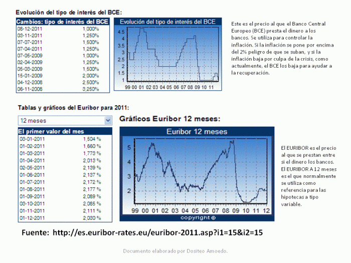 1.- Bajada del tipo de interés del 1,25 al 1%. El precio del dinero para los bancos baja, y estará bajo hasta que la inflación no vuelva a repuntar de forma clara y que refleje la recuperación de la economía europea. Esto nos afectará en que durante 2012 las cuotas de las hipotecas referenciadas al Euribor volverán a bajar y es una ayuda para reactivar el consumo y el ahorro en las familias y en las empresas.