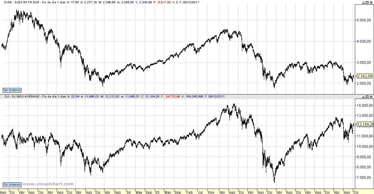 Según mi opinión los mínimos del mercado ya los hemos visto el pasado mes de octubre y 2012 será un gran año para la renta variable y también para la renta fija, por los mismos motivos.  Como podéis ver en estos dos gráficos, el DJ (índice de las 30 empresas más importante de la bolsa  de Nueva York), desde la crisis de la deuda en agosto se está recuperando mejor que el  EUROSTOXX 50 (índice de las 50 empresas más importantes de la bolsa europea), que repito una vez más, no creo que volvamos a los  mínimos de octubre, salvo que pase algo raro respecto de las medidas que se están tomando por parte del BCE y de los Estados de la UE que están en el euro.