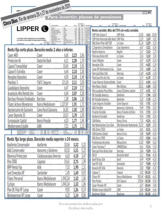 Os adjunto los datos del ranking de los mejores planes de pensiones que se comercializan en España, publicados por 5Dias. Es importante que tengamos claro que en España se comercializan más de 1.300 planes de pensiones y que este ranking resumido por 5Dias solo pone los que le caben en una hoja en función de lo que representan sobre el total.