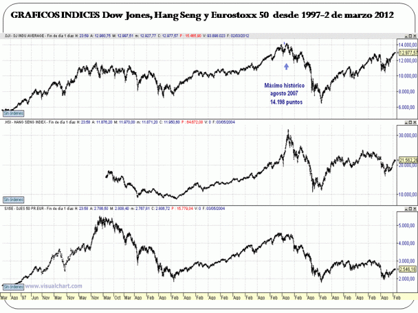 Dow Jones: Indice bursátil que mide la evolución de los precios de las acciones de las 30 empresas más importantes de EEUU. Hang Seng Index: Indice bursátil que mide la evolución de los precios de las acciones de las 33 empresas chinas más importantes que cotizan en la bolsa de Hong Kong. Eurostoxx 50:  Indice bursátil que mide la evolución de los precios de las acciones de las 50 empresas más importantes que cotizan en la bolsa europea.