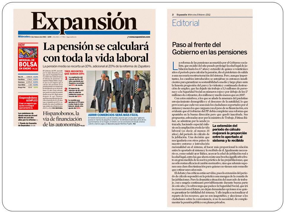 La otra noticia es que el gobierno volverá a reformar las pensiones antes de lo que pensábamos, si recordais el año pasado, en agosto, se publicó la última reforma, donde se aprobó un recorte de las pensiones públicas futuras  de un 30% de media, pues bien, próximamente este recorte aumentará en otro 10% de media, porque ahora se pretende aprobar que el cálculo de la pensión se realice con las cotizaciones de toda la vida laboral. Os aconsejo leer con interés el editorial de «Expansión» del pasado miércoles 8 de febrero, explica muy claramente el problema de las pensiones públicas.