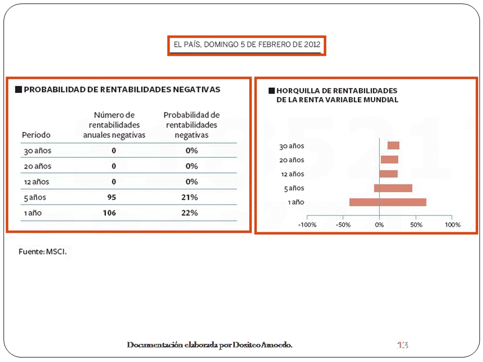 Para terminar os adjunto unos datos y un gráfico sobre la relación entre el plazo de las inversiones en renta variable y el riesgo de perder, por esto los asesores financieros decimos que las inversiones en renta variable, diversificadas utilizando fondos de inversión, son las más rentables  y seguras a largo plazo.