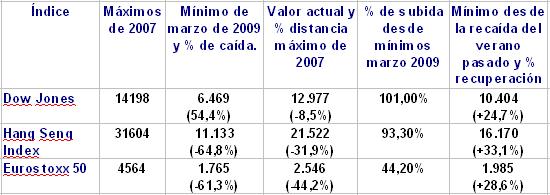 Vamos directamente al grano, y antes de nada analizamos que ha pasado en el mercado desde el verano pasado y también desde que se inició la crisis en agosto de 2007. Si volveis a leer las inserciones en el blog de agosto y septiembre del año pasado, mis recomendaciones eran aprovechar las bajadas del valor de las participaciones de los fondos de inversión para realizar compras, y explicaba cómo y por qué. LLevamos dos meses de este año  y como podéis comprobar en la tabla siguiente, el índice Dow Jones está casi en máximos históricos.