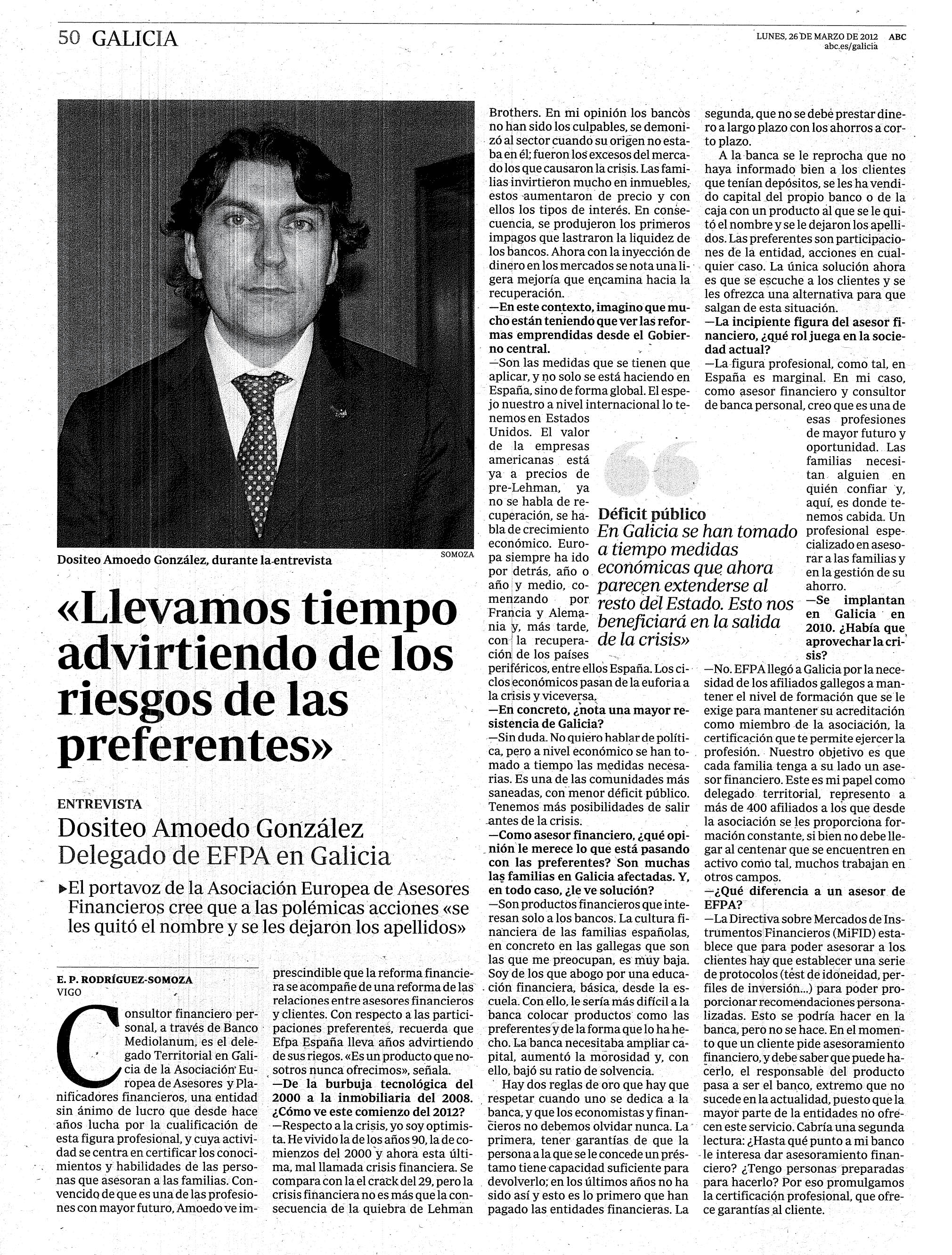 Entrevista a Dositeo Amoedo Delegado Comité Servicio Asociados  EFPA en Galicia,  ABC 26/03/2012.