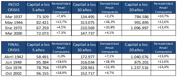 Las conclusiones son claras, cuanto más cerca del final de una crisis más probabilidades de obtener rentabilidades anuales mayores que la inflación y en la mayoría de los casos de dos dígitos, a plazos de 5, 10 y 20 años.