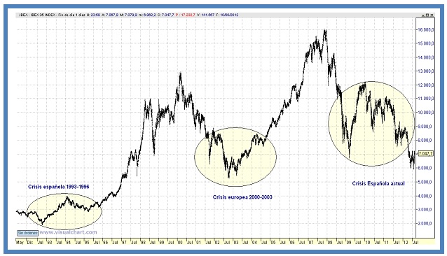 El ibex-35 ha hecho mínimo el 28 de mayo en 6065 puntos, a un 61% del máximo de inicio de la crisis en agosto de 2007 (15.819 puntos), desde esa fecha ha recuperado un 16,19%. No sabemos si volverá a mínimos o no, si bajará más o no, el caso es que tarde o temprano de esta crisis en España se saldrá y el ibex-35 volverá a máximos y seguramente los superará hasta que después otra crisis lo haga retroceder un nuevo tramo, como ha ocurrido en otras crisis y en otras euforias económicas. En el siguiente gráfico del ibex-35 se puede ver su comportamiento en las últimas 3 crisis.