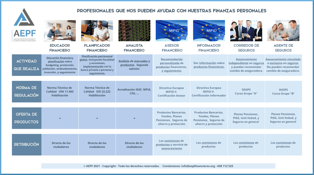 El educador financiero es el profesional que les puede ayudar a realizar su plan financiero familiar y a adquirir los conocimientos y habilidades para saber que tipología de productos utilizar, con quién comprarlos, si con un asesor financiero independiente, con un banco, o con una agente o corredor de seguros, y lo más importante, aprender a valorar los productos y el trabajo del profesional o de la entidad que se los ha vendido.